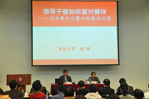 孟建從中央對領導干部能力建設的新要求、在與媒體合作服務的基礎上學會應對、全媒體環境下媒體溝通的運作機制和運作流程、全媒體環境下新媒體的傳播特點、提高全媒體拓展運用能力等方面,就當前如何做好突發事件中媒體應對工作做了系統講解。他指出,領導干部學會同媒體打交道的能力,是中央對各級領導干部能力建設提出的新要求。各級領導干部要樹立正確的媒體觀,克服在媒體應對中普遍存在的“不愿說、不敢說、不會說”的“三不”現象,要主動學會與媒體的合作和服務,切實增強本單位的軟實力。