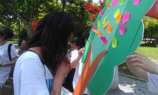 在活動現場,協會宣傳部的同學們制作了精美的“蘋果樹”,還準備了蘋果型的便利貼。當同學們中午下課以后,紛紛來到了“蘋果樹”前,在蘋果型便利貼上面寫下自己的心愿、積極向上的詞語、祝福等等,然后親自貼到蘋果樹上。之后,如果有同學如果發現上面有自己此時正需要的“正能量”詞語,她便可以撕下拿走,作為自己的“正能量”。