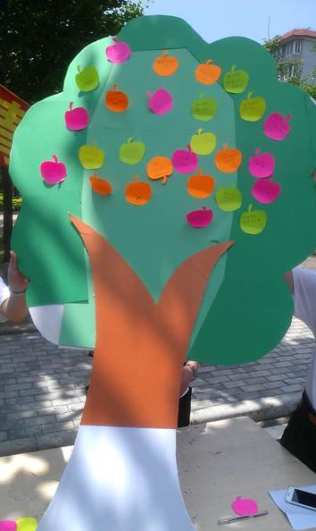 同學們的參與積極性都很高,來到蘋果樹齊前寫下了自己的“正能量”,希望它能傳遞給需要它的同學,蘋果樹也被五顏六色的果實填滿。
