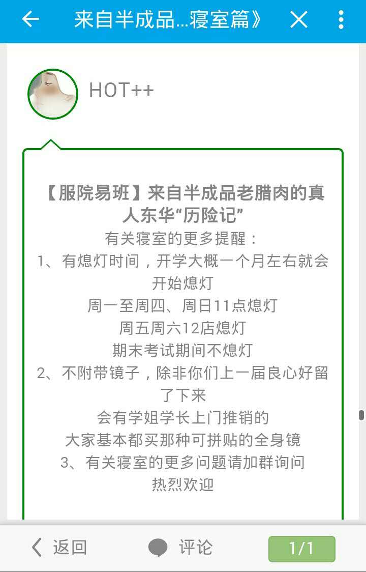 服裝學院易班發展中心學生團隊策劃了迎新主題的系列話題,以“來自半成老臘肉的真人東華‘歷險記’”為主題,生動幽默地介紹學院特色、易班資源、校園生活等信息,讓新生提前了解大學生活。系列話題包括易課堂番外篇、DHU介紹篇、飲食篇、學習篇、寢室篇、娛樂篇、到校路線篇、地鐵公交篇等幾大主題,篇篇內容豐富,語言極為生活化,并配有詳細的圖解,完全符合95后閱讀審美。