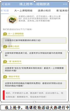 “線上搶書·選課經驗放送”活動展開以后,收到了同學們的廣泛好評,同學們參與度及積極性都非常的高,許多種類的書在很短的時間內被一搶而空,還有很多同學遺憾自己未能搶到書。