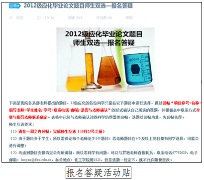 此次的畢業論文題目涉及范圍廣,同時指導教師的閱歷豐富,知識面廣,給同學們的可選擇性也很大。因此活動帖一經發出,同學們都紛紛回帖,聯系老師,確定畢業論文題目。截止10月23日,話題閱讀量達465次,評論數達66條。同時,各位課題組的指導老師也對同學的回帖進行答復。應用化學系本科教學