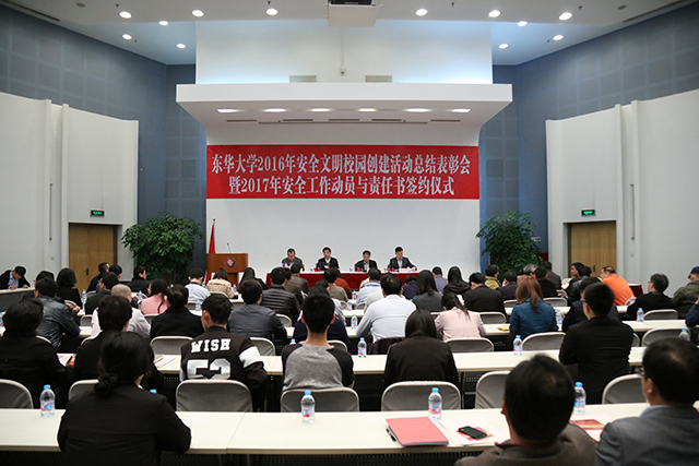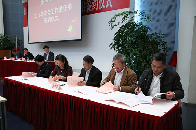 金海燕代表學校作2016年安全工作總結報告,并代表學校與各學院代表簽訂了2017年安全工作責任書。李永智宣讀2016年安全文明單位和先進個人名單。