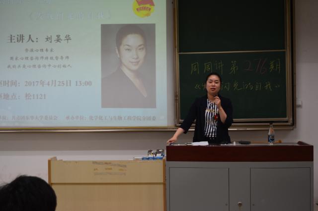 4月25日,美國心理協會精神分析師、資深心理專家劉晏華女士走進“周周講”校園講壇,為東華學子帶來一場題為“發現閃光的自我”的講座,對學生的成長規律進行解讀與剖析,幫助學生進行更加深入的自我認知,為學生今后的成長成才指明方向。