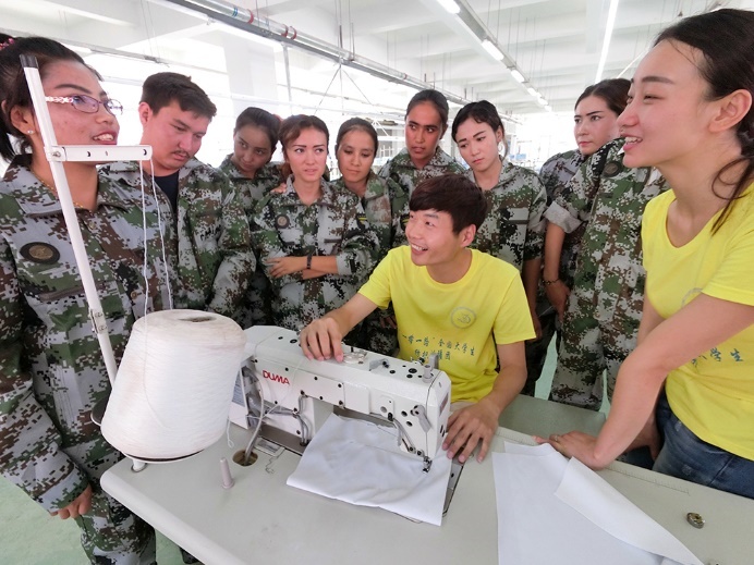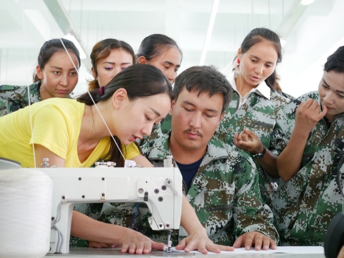 援疆團(tuán)為新疆瑞博服飾公司新員工講授新型縫紉機(jī)操作。