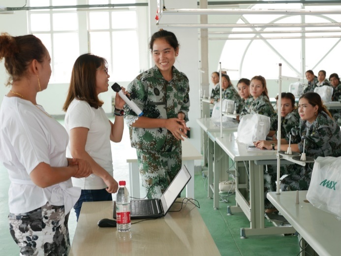 面對(duì)現(xiàn)代化裝備和零基礎(chǔ)員工,邱夷平知道他們需要什么,他早已請(qǐng)泉州師范學(xué)院專業(yè)教師崔麗娜備好入門(mén)課。“看見(jiàn)紅色,你們想到什么?”崔老師指著瓶裝水的紅色包裝問(wèn)。經(jīng)過(guò)翻譯,工人們紛紛回答“婚禮、國(guó)旗、辣椒……”同胞們都笑了,這正是服裝色彩設(shè)計(jì)和搭配的基本感覺(jué)。同期,來(lái)自天津工大、蘇州大學(xué)等校師生則手把手為縫紉組調(diào)試并教授了新型縫紉機(jī)具。