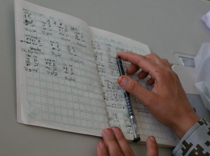 “綠色、綠色……”“紅色、紅色……”二樓大平層傳來(lái)陣陣誦讀聲,300多名身著迷彩工裝的維吾爾族新員工,在一名通曉漢語(yǔ)的班組長(zhǎng)領(lǐng)讀下,齊聲復(fù)讀各種顏色單詞,對(duì)照著縫紉臺(tái)上的雙語(yǔ)筆記。