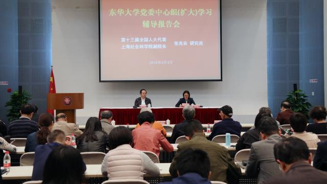張兆安介紹了本次全國“兩會”的基本情況和上海代表團(tuán)的履職情況,傳達(dá)了習(xí)近平總書記在“兩會”上的重要講話精神,并就憲法修改、審議通過《中華人民共和國監(jiān)察法》、國務(wù)院機(jī)構(gòu)改革方案等重要議題進(jìn)行了闡述。他通過生動形象的案例,結(jié)合政府工作報(bào)告,從國際政治經(jīng)濟(jì)形勢、推動高質(zhì)量發(fā)展、形成新的開放體系、創(chuàng)新社會治理、精準(zhǔn)扶貧、生態(tài)環(huán)境保護(hù)、鄉(xiāng)村振興戰(zhàn)略等方面作了深入解讀。他還結(jié)合上海經(jīng)濟(jì)社會發(fā)展,就長三角一體化發(fā)展、優(yōu)化營商環(huán)境、打造上海“四個(gè)品牌”等熱點(diǎn)問題分享了自己的學(xué)習(xí)體會。