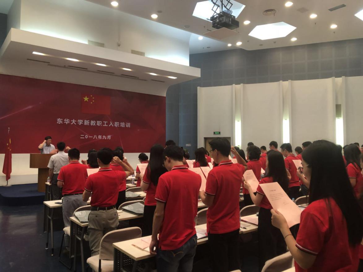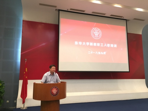 卿鳳翎在主持中介紹了我校2018新進教職工入職培訓的基本情況。先期已開展了專題網課培訓以及素質拓展等活動,發放的新版《東華大學教師手冊》以服務教師為宗旨,幫助教師特別是新進教師們能夠更快、更好地了解學校相關政策、規定、辦法和辦事流程等。