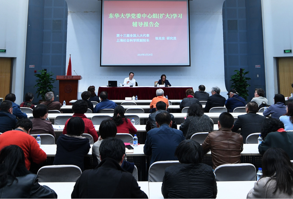 3月29日,校黨委理論學習中心組召開黨委理論中心組(擴大)學習會,邀請第十三屆全國人大代表、上海社會科學院副院長張兆安研究員作學習貫徹2019年全國兩會精神專題輔導報告。學習會由黨委副書記劉淑慧主持。