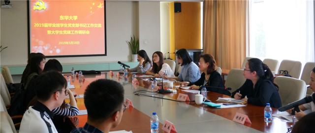 5月10日,2019屆畢業班學生黨支部書記工作交流暨大學生黨建工作調研會在松江校區召開,黨委副書記崔運花出席,各學院畢業班學生黨支部書記代表及黨委組織部、黨校相關同志參會。