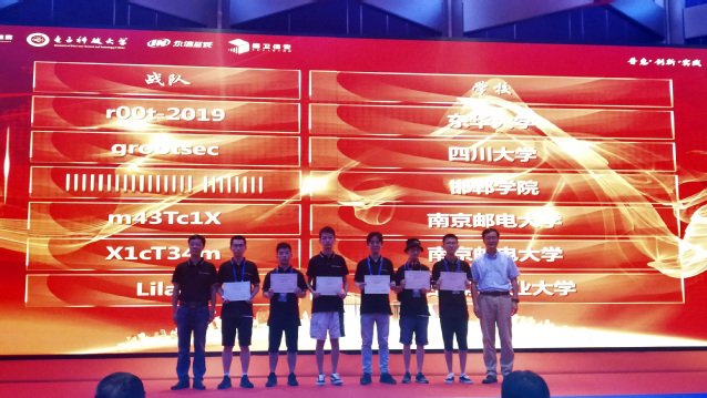 7月26至27日,第十二屆全國大學生信息安全競賽創新實踐能力賽總決賽在成都舉辦。大賽由教育部高等教育司、工業和信息化部信息安全協調司指導,教育部高等學校信息安全類專業教學指導委員會主辦,共有來自486所高校的1400多個參賽隊伍的5000多名學生參與線上賽,最終80個隊伍進入決賽。由計算機學院2017級本科生高新博、馬靖宇、黃運發、鄭伊靜、朱冠宇、孔祥東組成的我校R00t-2019戰隊最終獲全國一等獎。
