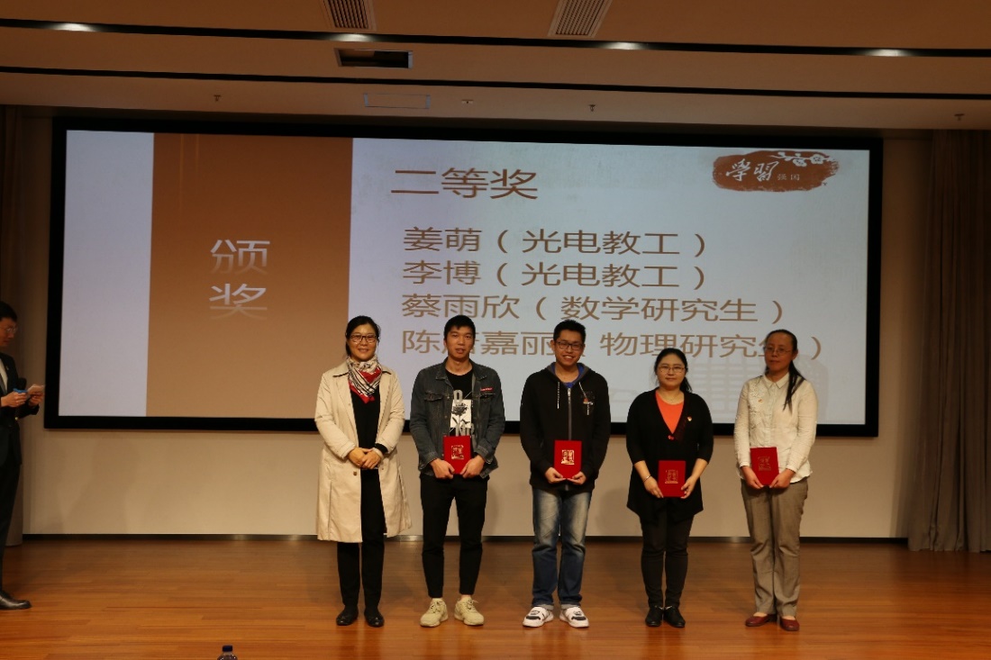 本次競賽將“學習強國”平臺內的的學習內容融入到競賽中的必答題(選擇題)、搶答題(填空題)和附加題三個環節,競賽題目包含歷史知識、中國共產黨理論知識、古典詩詞等各個方面。經過一番激烈角逐,最終,物理系研究生黨支部奪得第一名。比賽現場還設置了觀眾搶答環節,工作人員準備了豐富的備選題與搶答題,供大家共同學習、交流。