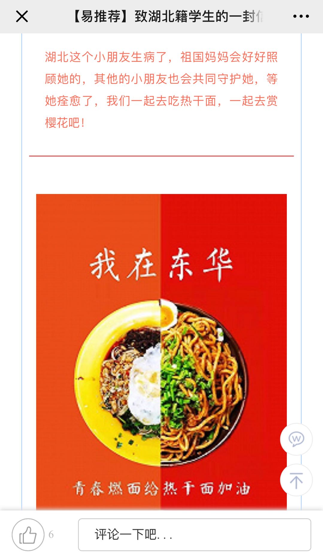 學(xué)校易班平臺(tái)推出《東華故事》之“2020,明天會(huì)更好”,積極進(jìn)行疫情防護(hù)知識(shí)教育,發(fā)布“了解新型冠狀病毒”“新型冠狀病毒感染的肺炎防護(hù)小知識(shí)”以及“不計(jì)報(bào)酬,無(wú)論生死”等專題帖,提醒全校師生調(diào)整心態(tài)、正確防護(hù),用心用行共抗疫情。發(fā)布《致湖北籍學(xué)生的一封信》,讓學(xué)生在居家期間,感受到學(xué)校的關(guān)心和溫暖。組織開(kāi)展“守護(hù)你我 愛(ài)滿天下”抗擊疫情網(wǎng)絡(luò)作品征集活動(dòng),累計(jì)收到100余份原創(chuàng)作品。在《戰(zhàn)“疫”里不倒的中國(guó)力量》音頻課上,來(lái)自管理學(xué)院的5位輔導(dǎo)員老師與學(xué)生一起感知中國(guó)力量,理解大愛(ài)仁心,勇?lián)鷷r(shí)代使命,努力成為一名傳播愛(ài)、奉獻(xiàn)愛(ài)和充滿愛(ài)的新時(shí)代中國(guó)青年。