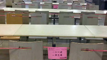 在食堂,除了“北歐排隊”,“國考吃飯”也是必要素質,在抗“疫”特殊時期,1米線成為學校食堂就餐的標準線。“前后左右間距均為1米,吃出了國考的感覺。”只有保持足夠距離才能產生美,將風險降到最低,才能在防疫大考中得高分。兩個校區食堂均開放部分窗口,保證供應,并在食堂顯著位置提醒大家“錯時錯峰、限流用餐、自帶餐具、打包外帶”。同時,學校不間斷地對食堂內外、餐具用具進行清洗消毒,讓返校返崗的教職工吃得更踏實。
