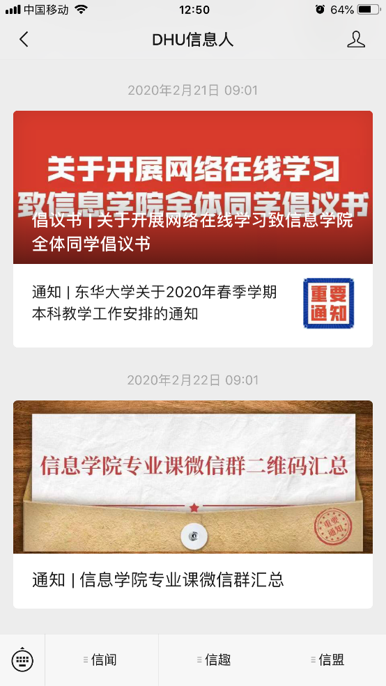(DHU信息人微信公眾號(hào)發(fā)布網(wǎng)絡(luò)在線學(xué)習(xí)倡議書和微信群二維碼)