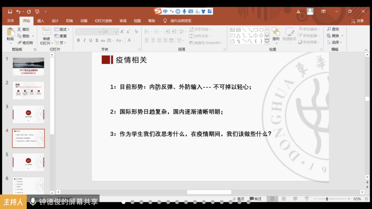輔導員鐘德俊代表學院問候大家,并囑咐大家在家要繼續自我隔離,注意個人安全防護,盡量少外出,在疫情的最后階段也不能放松,遵守學校及當地政府的各項通知要求。在線班會互動,對持續加強學生防疫意識、增強學生抗擊疫情的信心和能力發揮重要作用,營造了防疫情、鼓士氣、筑同心的良好氛圍,在云端傳遞出溫暖和正能量。鐘老師還介紹了當前學校、學院針對疫情情況的各項政策、通知,給大家帶來了信心,相信在國家、學校、學院的正確決策部署下,大家一定能在春暖花開時,集聚美麗校園。