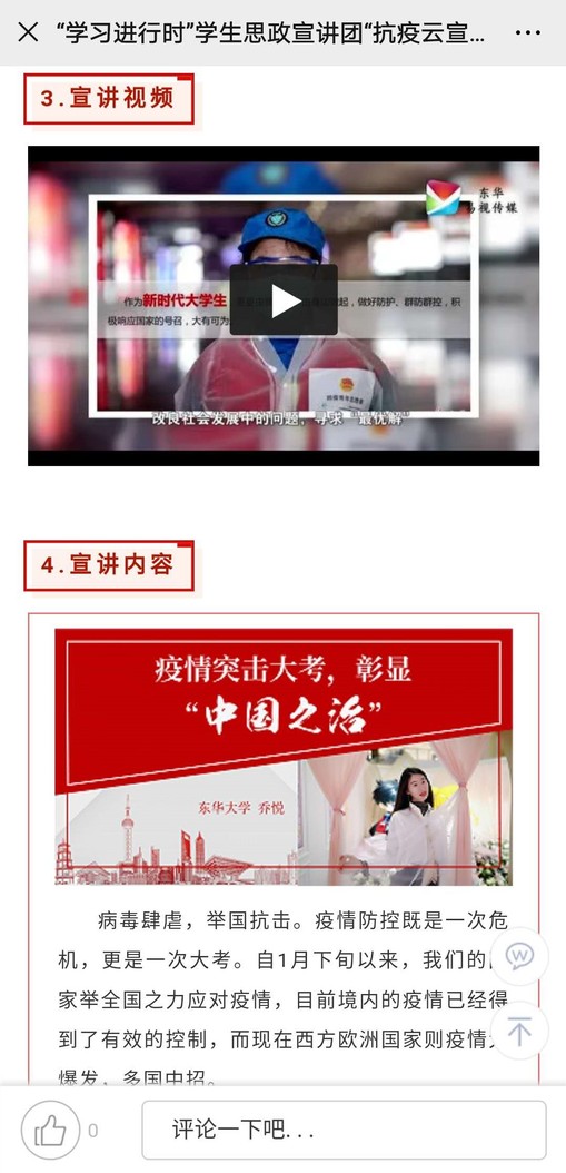 《疫情大考中的中國之治》《做理性思辨的網絡守護者》等“云宣講”系列線上微課一經上線,單日瀏覽量過千,累計視頻點擊率過萬,“云宣講”的學生講師們通過圖文并茂的演繹形式、喜聞樂見的網言網語迅速吸引眾多學生聽眾成為宣講團的鐵桿“粉絲”,用朋輩的力量號召青年學生做網絡安全的守護者和踐行者。