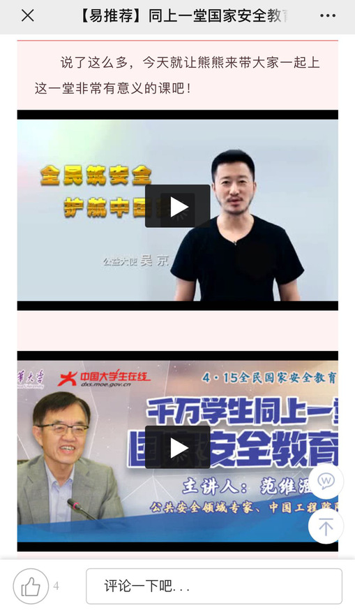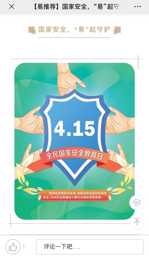 學校在踐行立德樹人根本任務過程中,將青年大學生培養成國家安全知識的積極傳播者放在重要位置。充分利用易班優勢網絡平臺開展網絡安全“云教育”,面向全校師生推出《同上一堂國家安全教育課》,通過線上授課的形式,共同學習了教育部組織錄制2020年全民國家安全教育日高校公開課,由公共安全領域專家、中國工程院院士范維澄講授的《總體國家安全觀視角下的疫情防控》,累計閱讀量達3000余次。開展“我眼中的總體國家安全觀”網絡作品征集活動,鼓勵全校師生利用專業所長創作漫畫、詩歌、視頻等網絡文化作品,用形式多樣的作品展現國家安全觀的具體內涵、以詩情畫意的方式表達學生捍衛國家安全的決心。同時,推出“國家安全,‘易’起守護”“中國看世界,世界看中國”等國家安全教育專題貼,以圖文并茂的形式引導學生認識到國家安全、人人有責!