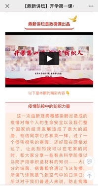 如何利用好互聯(lián)網(wǎng)開(kāi)展思政教育是疫情期間的一大課題。學(xué)校打造“青春戰(zhàn)疫”云平臺(tái),推動(dòng)思想政治工作傳統(tǒng)優(yōu)勢(shì)同信息技術(shù)高度融合,易班平臺(tái)推出“夢(mèng)想的聲音”同頻戰(zhàn)疫系列專欄,發(fā)布《愛(ài)祖國(guó)責(zé)任在心,抗疫情落實(shí)在行》《疫情教會(huì)我們“敬畏”》等一系列輔導(dǎo)員博文共計(jì)24篇,總瀏覽量達(dá)10000余次;輔導(dǎo)員協(xié)會(huì)“杏壇微語(yǔ)DHU”微信公眾號(hào)推出《攜手同心,共抗疫情》愛(ài)國(guó)主義教育系列推送;打造東華大學(xué)bilibili直播平臺(tái),“砥礪奮進(jìn)”生涯規(guī)劃大賽、“五四精神、傳承有我”等主題互動(dòng)直播,講好黨的領(lǐng)導(dǎo)下人民抗擊疫情的感人故事。