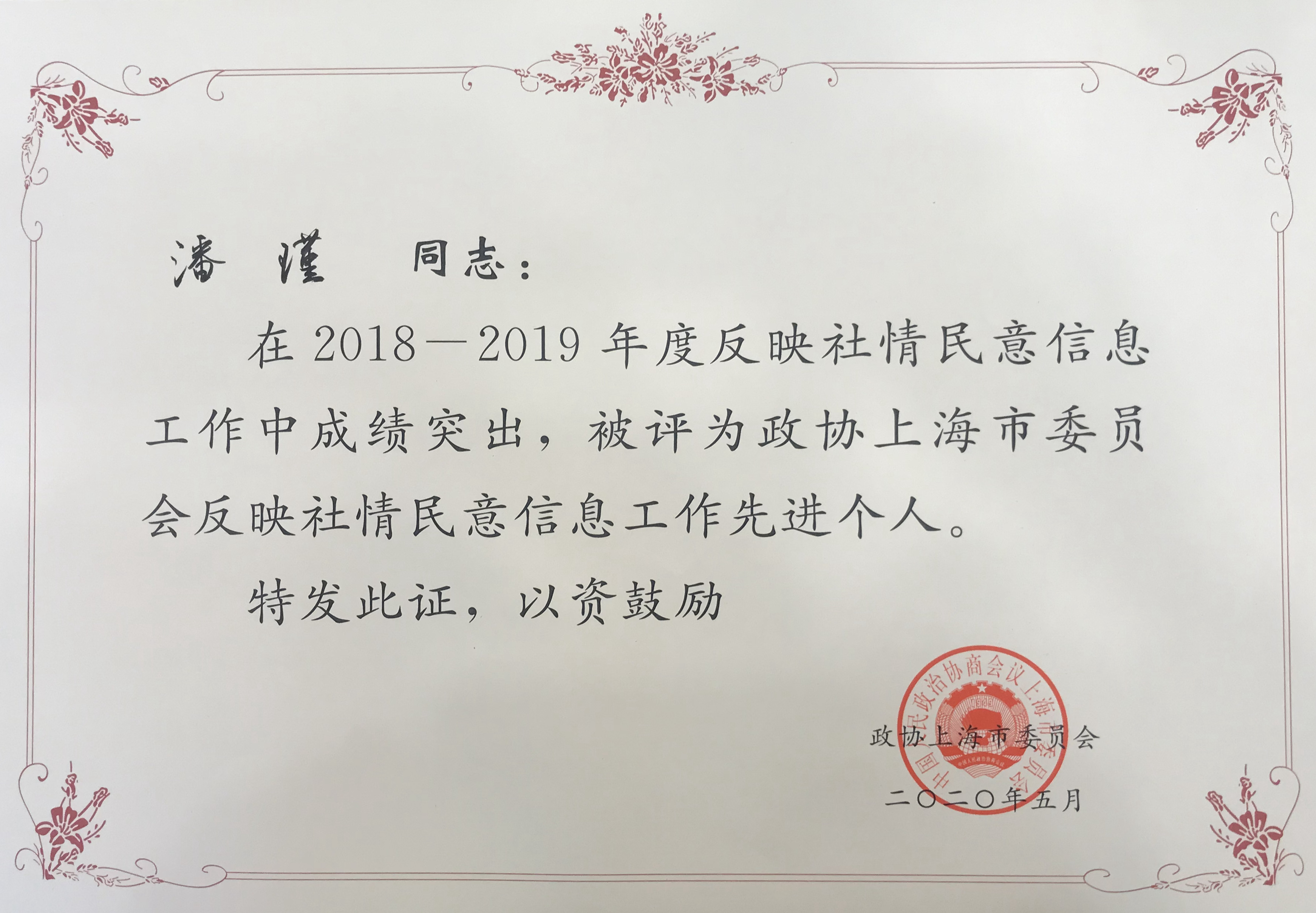 5月13日,上海市政協召開社情民意信息工作會議,深入貫徹中央和市委政協工作會議精神,總結經驗、明確思路,就進一步做好反映社情民意信息工作作出部署。會議表彰了反映社情民意信息工作先進單位、先進個人。市政協委員潘瑾獲得先進個人(全市共20名,含在滬全國政協委員),繼2015-2016年度后再獲殊榮。