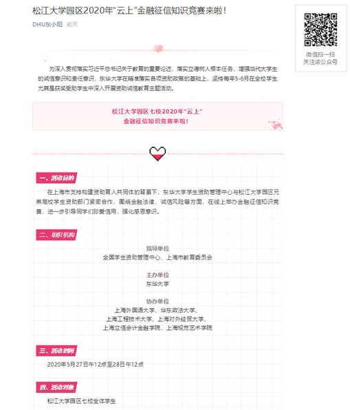 據悉,根據《教育部辦公廳關于開展高校學生資助誠信教育主題活動的通知》(教資助廳函〔2013〕1號)精神,我校堅持每年5-6月在全校學生尤其是獲獎受助學生中深入開展資助誠信教育主題活動。今年,在疫情防控常態化以及上海市支持構建區域資助育人共同體的背景下,我校與松江大學園區兄弟高校密切合作,創新開展線上主題教育,內容包括金融安全知識微課、不良貸警示片輪播、七?!霸粕稀苯鹑谡餍胖R競賽、典型案例征集等活動,以期更好的達到增強大學生誠信與責任意識的育人目標。