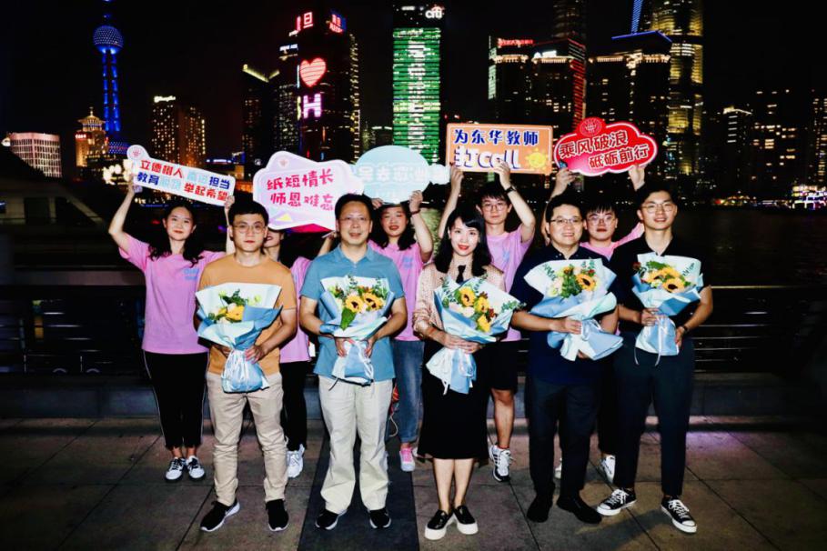 9月9日晚,師生代表前往外灘參加教師節慶祝活動,“外灘之窗”為教師送上節日祝福,學生代表為老師們獻花,師生在熱烈的氛圍中共同慶祝節日。