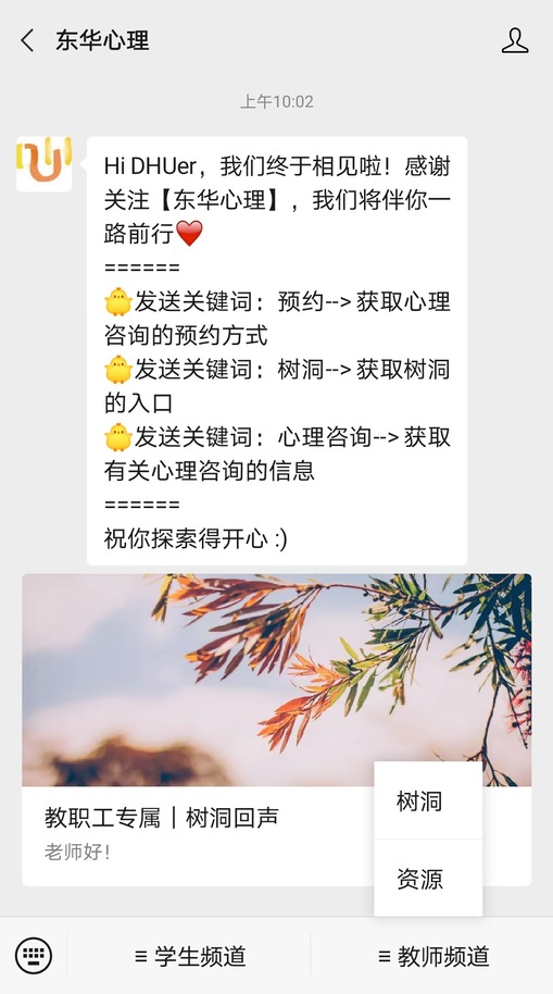 3.  關注微信公眾號“東華心理”(dhuxinli),進入“教師頻道”,點擊“樹洞”,則可查看進入樹洞的方式。