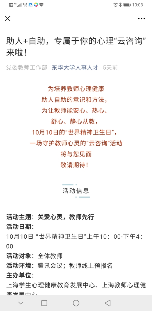 我校承辦“10?10”上海教師心理健康促進云咨詢活動