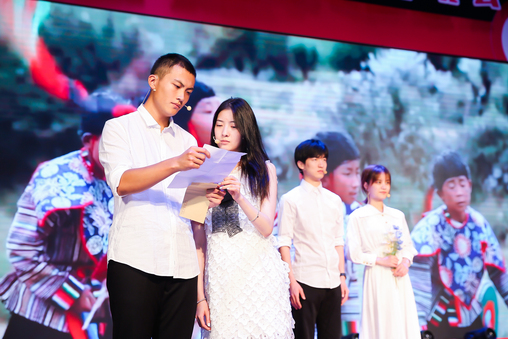 舞臺上,以東華大學歷任鹽津縣駐村書記為原型的話劇《援滇日記》正在上演,這是援滇一線扶貧干部看似普通又忙碌的一天,更是祖國新農村脫貧路上的一個縮影。從黃浦江畔到彩云之南,從新中國第一所紡織高等學府到西南邊陲的國家級貧困縣,東華大學和鹽津相距2000多公里,因扶貧而結緣。“繼續當好愛心快遞小哥”,扶貧沒有休止符。現場東華大學掛職云南省鹽津縣副縣長范金輝老師、東華大學駐鹽津縣黃草社區第一書記董曉光老師通過“云”連線,道出了東華人扶貧路上的點點滴滴。“謝謝你,感謝有你”,家鄉更美麗!連線最后,鹽津縣黃草小學的同學們帶來了合唱《聽我說謝謝你》,孩子們純真幸福的笑臉是對東華人和東華扶貧工作最好的褒獎。