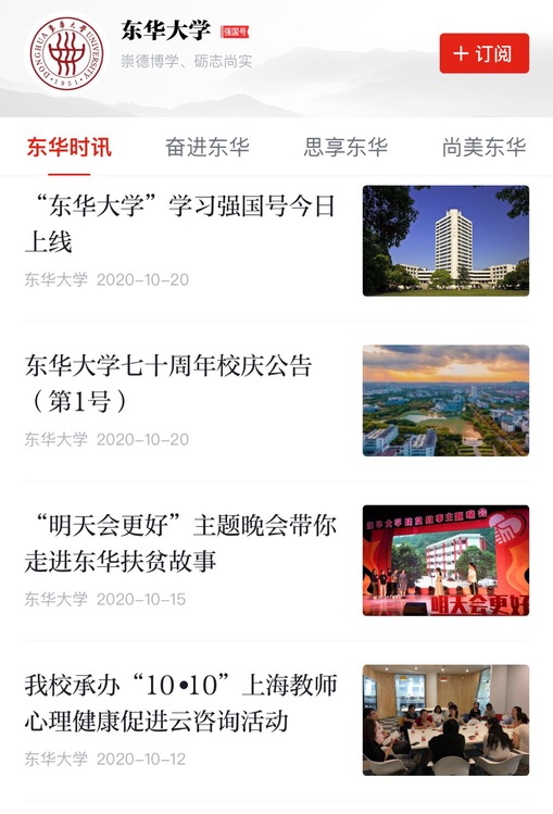 “東華大學”學習強國號開設“東華時訊”“奮進東華”“思享東華”“尚美東華”等欄目,多角度呈現東華大學在人才培養、科學研究、服務社會、文化傳承創新、國際合作交流等方面的新進展、新成果、新風貌。在這里,您可以了解東華大學最新資訊動態、學術科研成果、優秀學人故事,品讀師生理論研究文章、理論學習體會,欣賞優質在線課程,領略美美與共的文明校園風貌。