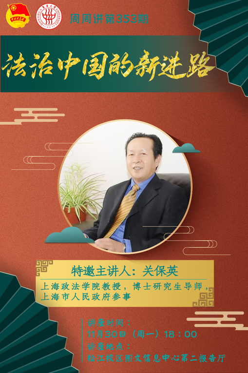 主講人:關保英,上海政法學院教授(二級),博士研究生導師,上海市人民政府參事,曾任上海政法學院副校長。現擔任教育部重大攻關項目首席專家;中國體育法學研究會副會長;中國法學會行政法學研究會學術委員會副主任;中國行政執法研究會副會長;上海市人民調解法治研究會會長;上海市法官檢察官遴選(懲戒)委員會委員;上海市規范性文件審查中心主任。曾任教育部教學指導委員會委員。