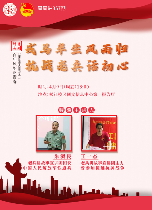 內容簡介:本次“百年風華正青春”系列周周講暨團員青年學黨史第三講邀請松江老兵宣講團走進校園,以《戎馬半生風雨歸,抗戰老兵話初心》為主題講述紅色故事,傳承紅色基因。