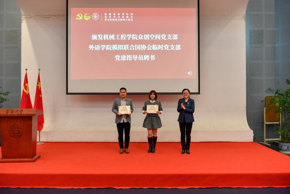崔運花和機械學(xué)院黨委書記王新厚、外語學(xué)院黨委書記李佳耀以及社團黨支部黨員代表共同為機械學(xué)院眾創(chuàng)空間黨支部、外語學(xué)院模擬聯(lián)合國協(xié)會臨時黨支部揭牌。黨委組織部部長林嶸為第一批學(xué)生社團黨支部黨建指導(dǎo)員頒發(fā)聘書。
