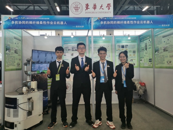 機械學院的“多機協同的棉纖維柔性作業云機器人”項目獲得上海市一等獎。團隊針對智能工廠機器人協同柔性作業的難題,提出了多合一柔性作業末端執行器、氣電協同控制算法、云端調度系統,實現了高質高效協同作業。為智能工廠提供了一種多機協同的“云-邊”互動解決方案,助力中國智造。