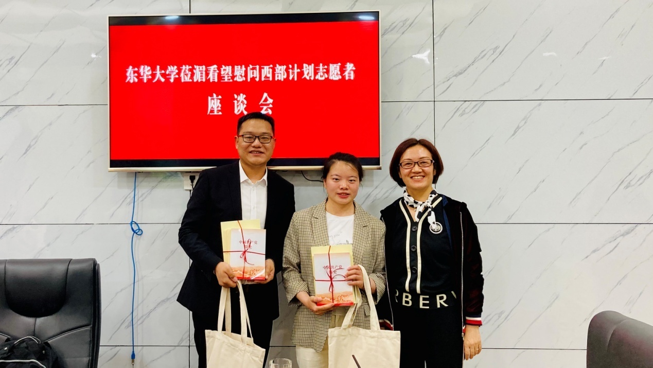 座談會上,劉淑慧與研支團成員親切交談。從所學專業到任教學科,從工作目標到未來規劃,詳細全面了解了他們的工作生活情況。劉淑慧對匯川區區政府、遵義市第三十五中對3位志愿者的關心、重視及肯定表示感謝,對匯川人民投身易地扶貧搬遷工作、鄉村振興建設所做的努力表示敬佩。她指出,近一年時間,3位同學用激情和事業心對待支教工作,承擔起了人民教師的責任,同時利用自身學科優勢,結合學生需求,在孩子們的心中種下希望的種子。她勉勵研支團成員,要珍惜支教生活的每一分每一秒,做好教育幫扶工作,要用心、用情、用自己的所學為服務地做好服務,為匯川教育、國家鄉村振興事業貢獻東華力量。