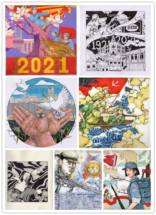 在學院黨委的引領下,學院教師堅持立德樹人,充分發揮課堂育人的主渠道作用,積極探索黨史學習教育融入教育教學全過程的新途徑。視傳系主任彭波教授指導學生以“建黨百年”為主題開展畢業設計,相關視覺形象海報和衍生產品在畢業季展覽時讓人眼前一亮。美術學部主任李海峰副教授、李軍平副教授在《圖案設計》的藝術類基礎課上,帶領大一學生圍繞新四軍題材進行圖案設計,將課程上成了富有深意的藝術特色黨史學習課。在老師的指導下,同學們積極收集、學習新四軍相關歷史資料,在深入了解的基礎上進行了藝術創作。師生們很自然地把黨史學習教育的使命和專業課、基礎課的教學目標有機結合起來,使黨史學習教育更加鮮活,更加生動。