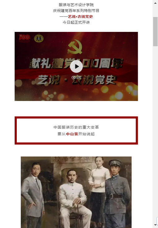 黨史學習教育重在實效,面向廣大青年師生的黨史學習教育,尤其講究溫度與智慧。學院黨委堅持小切口、高站位,聚焦專業的小知識點,將黨史學習教育內容與學院專業特色有機結合,策劃開設“藝說·衣說黨史”專欄,師生聯袂齊上黨史大課,圍繞中山裝、文明新裝、人民裝、軍裝與工作裝、國際化時裝、功能服飾設計、時尚與創意服飾8類服飾,開設6堂黨史微課,展現中國近代新歷程。