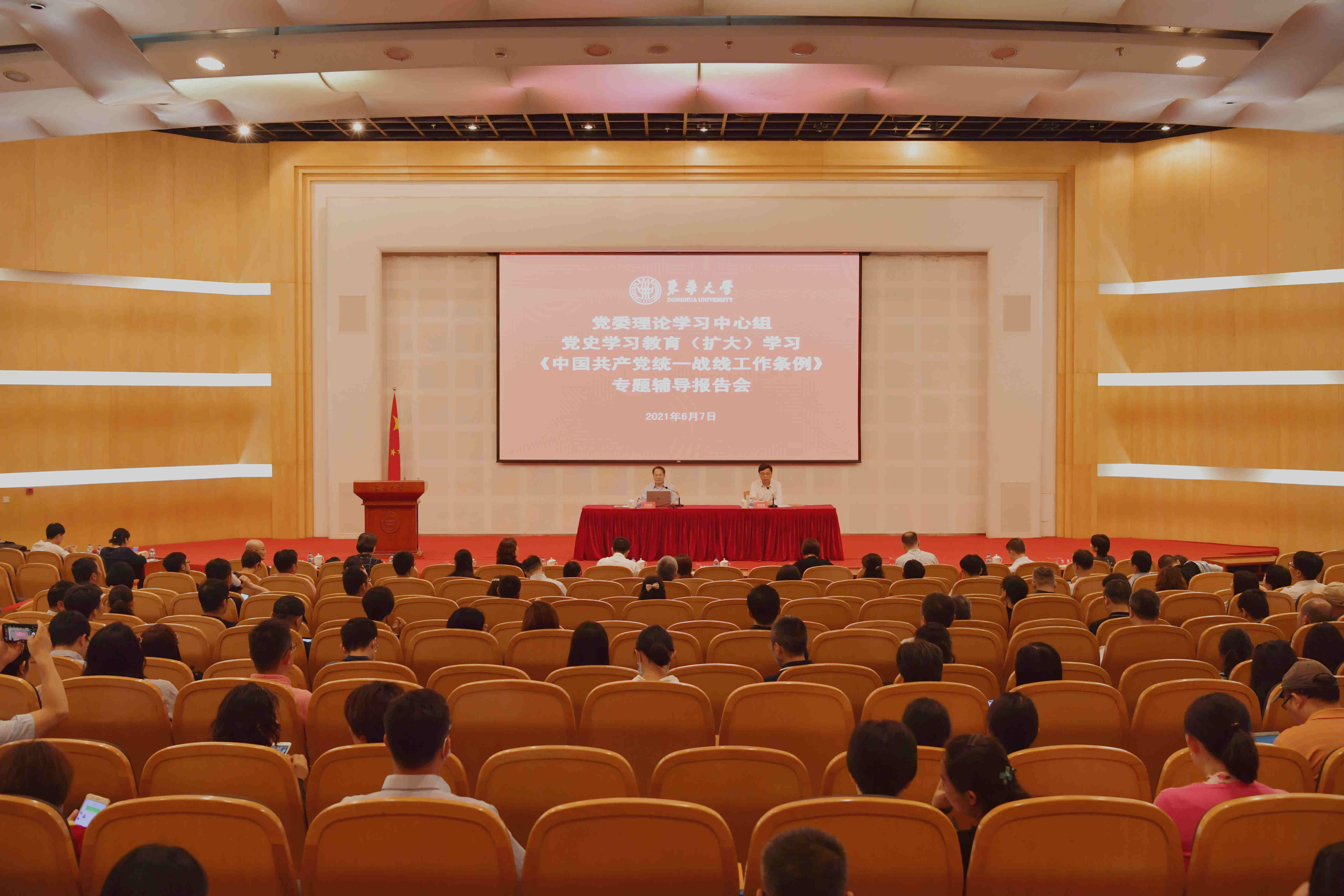 6月7日,校黨委理論學習中心組在松江校區舉行黨史學習教育(擴大)學習報告會,邀請上海市委統戰部副部長房劍森作《中國共產黨統一戰線工作條例》(以下簡稱“條例”)專題輔導報告。黨委書記劉承功,校長俞建勇,黨委副書記劉淑慧、崔運花、王云駿,副校長邱高、陳革、李煒,黨委常委朱英、任曉杰參加學習。劉承功主持學習報告會。
