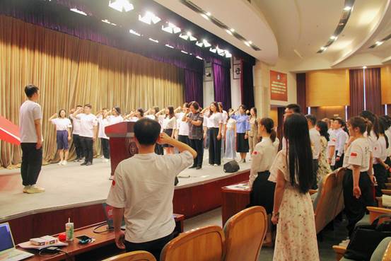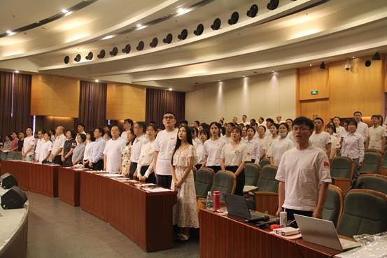 丁霞萍帶領29位新黨員在黨旗下鄭重宣誓,全體師生黨員重溫入黨誓詞,號召全體師生黨員永葆政治本色、永葆革命和奮斗精神,牢記為人民服務的初心使命。