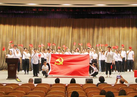 丁霞萍帶領29位新黨員在黨旗下鄭重宣誓,全體師生黨員重溫入黨誓詞,號召全體師生黨員永葆政治本色、永葆革命和奮斗精神,牢記為人民服務的初心使命。