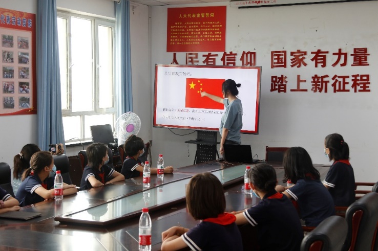 (實(shí)踐團(tuán)成員向荒地鄉(xiāng)學(xué)生介紹五星紅旗背后的故事)