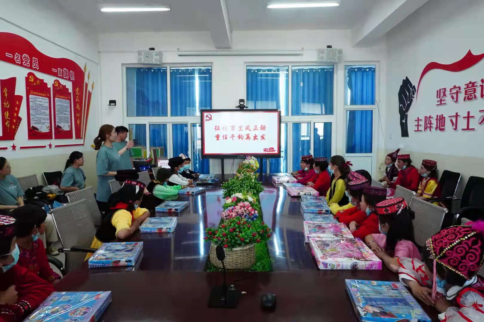 實踐團成員充分發揮自身黨員優勢,圍繞“賡續黨史精神、書寫百年華章”在新疆開展豐富多樣的黨史宣講主題教育活動。通過黨史故事講述、紅色知識問答等形式,利用當地的黨史教育館等資源進行課內課外相結合的教育活動。“姐姐們講課很有意思,原來五星紅旗背后還有這樣一段故事呢。今后我要更加努力地學習,長大報效祖國,讓家人們為我驕傲。”少數民族學生熱依汗古在課后拉著授課老師的手,熱情地說道。