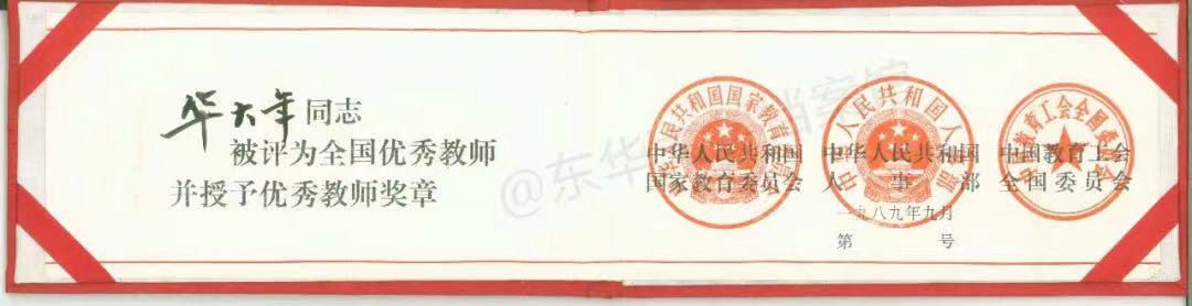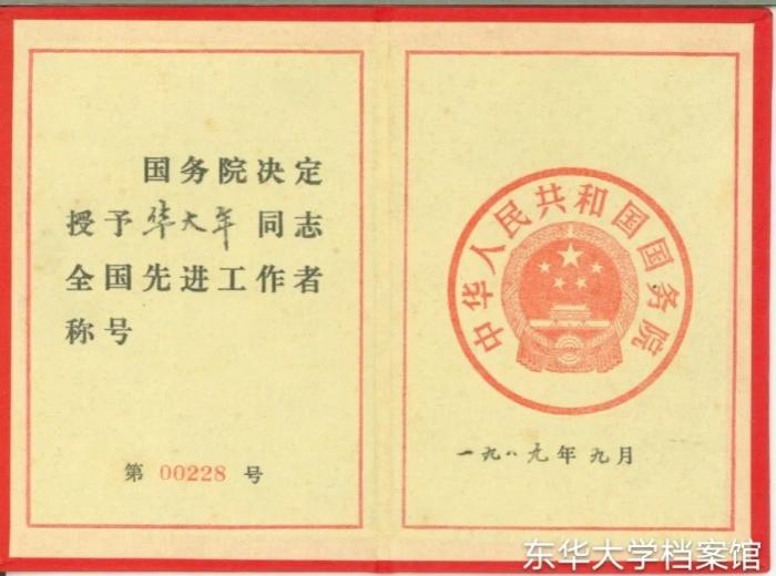 (1989年華大年教授獲全國先進工作者證書、獎章)