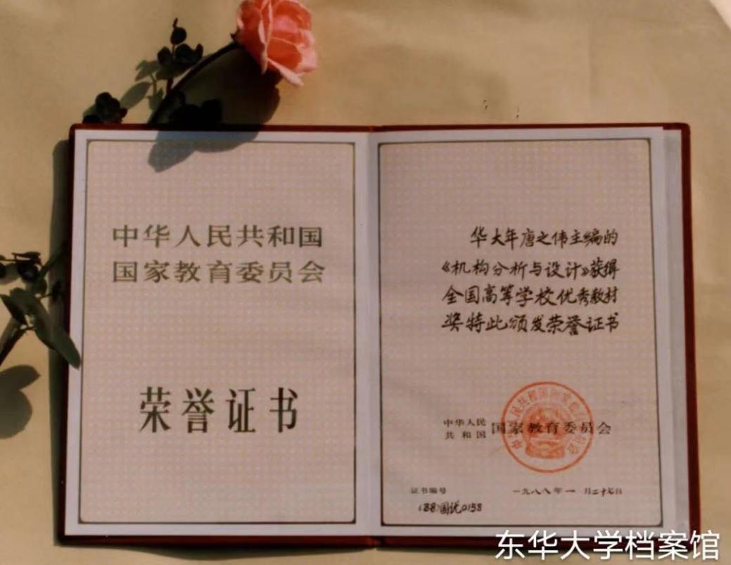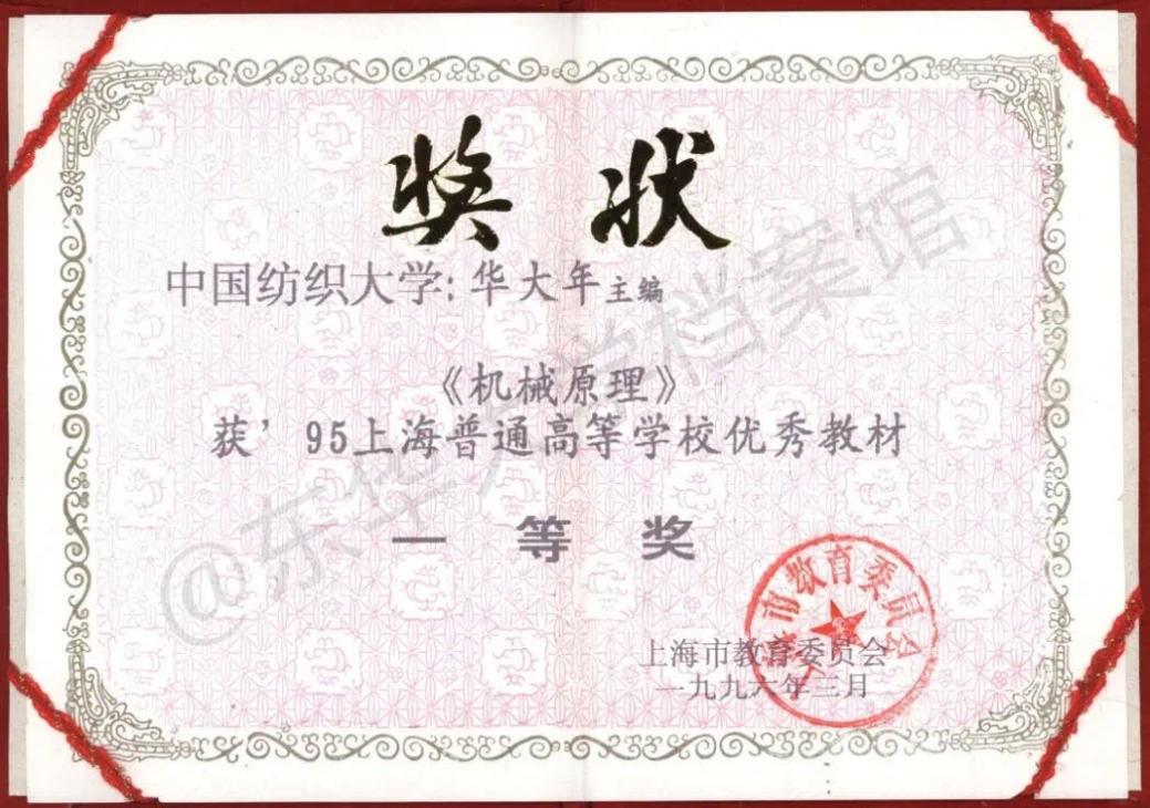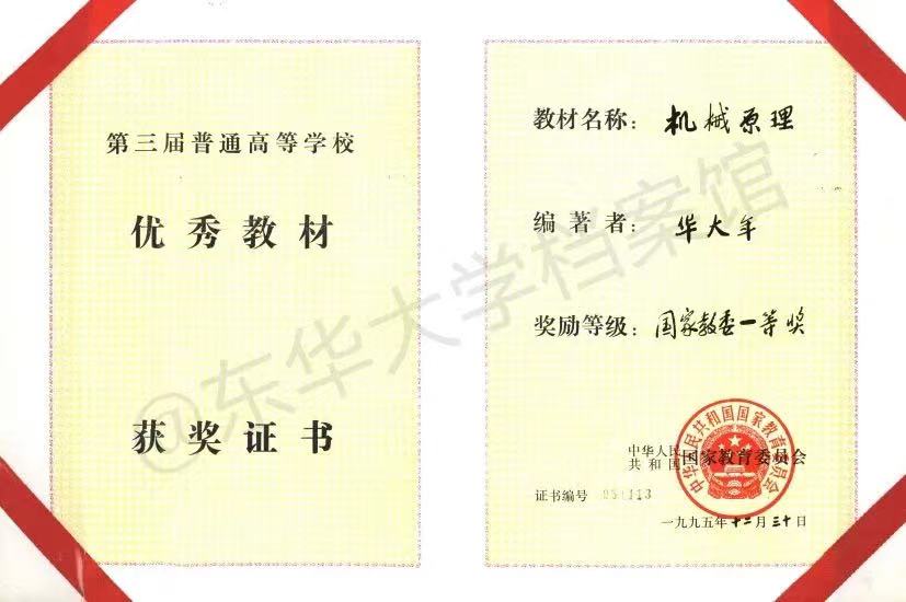 (1995年《機械原理》獲國家教委優秀教材一等獎證書)