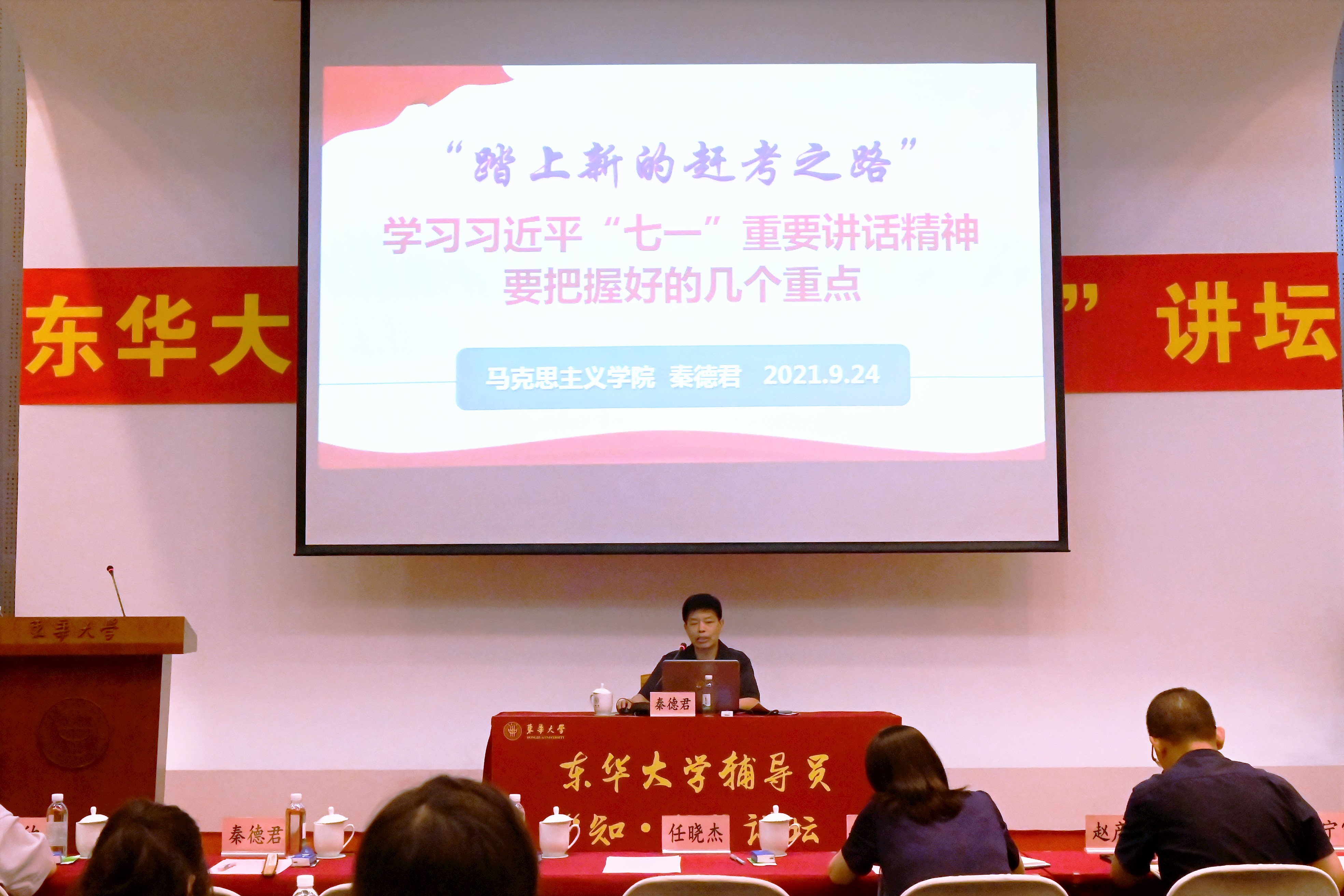 啟動儀式后,馬克思主義學院秦德君教授帶來首講報告——《“踏上新的趕考之路”——學習習近平“七一”重要講話精神要把握好的幾個重點》專題輔導報告。他從習近平總書記“七·一”重要講話的思想價值與學習重點、“新趕考”的辯證關系和歷史意義、學習七一重要講話重在推動工作等3個方面對習近平總書記“七一”重要講話精神進行深入闡釋,并就學生思想政治教育工作應該如何貫徹落實好習近平總書記“七一”重要講話精神作了解讀和分享。隨后,校心理健康教育與咨詢中心副主任田園做題為《輔導員心理危機干預及醫教結合工作貼士》的專題講座,從工作實務角度為輔導員如何運用心理學專業知識,處置學生心理危機事件開展了專業輔導。