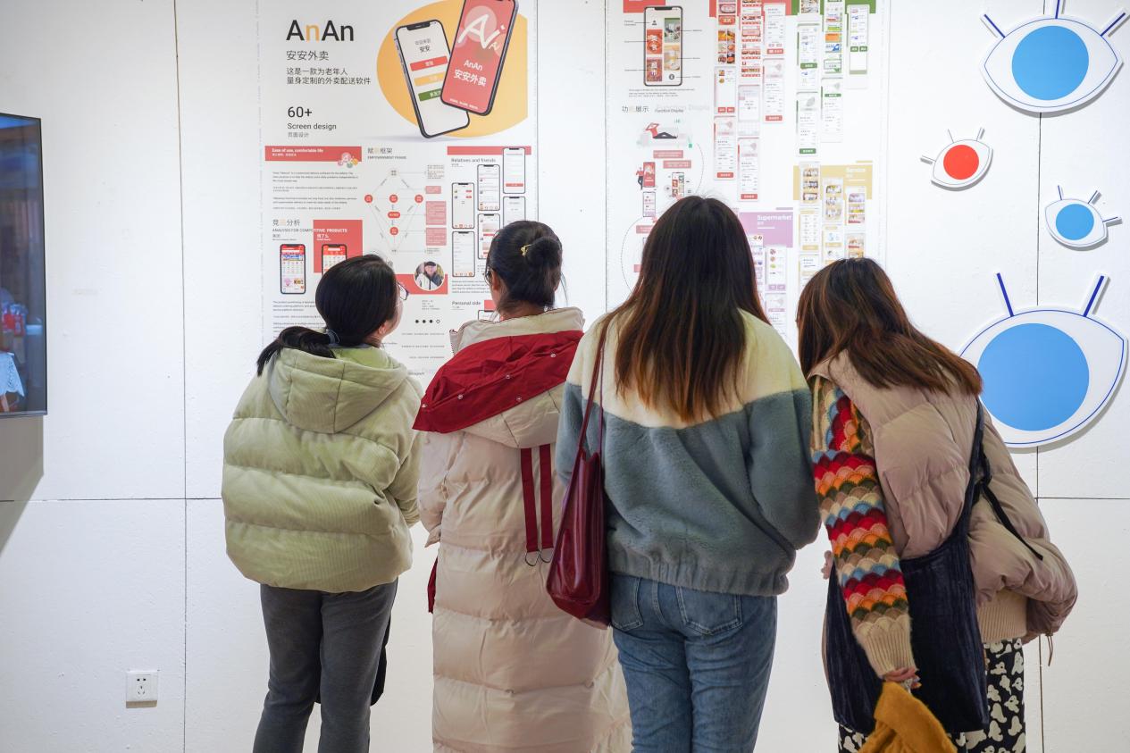 第二部分社會實踐及創新創業優秀成果展,展示了學院近三年來的社會實踐和創新創業成果。學院團委通過“衣食住行樂”五大板塊,展示了近三年優秀實踐團隊的項目成果,通過各團隊的實踐vlog、媒體采訪報道視頻、實際成果產出、暑期社會實踐材料匯編等多種形式和不同視角展現學院在社會實踐方面融合學科發展、服務人才培養取得的成績。三年來,學院共組織社會實踐項目117支,其中轉化為雙創比賽項目43個,共獲“挑戰杯”國家級三等獎1項,“互聯網+”上海市銀獎2項、銅獎3項,“知行杯”上海市特等獎1項、三等獎4項。經過多年探索,學院圍繞非遺傳承、城市發展、鄉村振興、可持續環保等方面探索設計介入的新模式,取得了優異成績。展覽最后,青年志愿者協會和科學商店分別展示了特色項目“牽手藝術彩虹,共創美好生活”“非遺工作坊”的特色成果,展現了學院在長寧區探索“環東華”美育志愿服務平臺的建設成效。