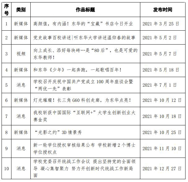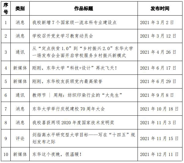 《學校召開黨史學習教育動員會》《劍指高水平研究型大學目標——寫在“十四五”規劃發布之際》等10篇作品獲評“2021年度校園好新聞”,《學校召開慶祝中國共產黨成立100周年座談會暨“兩優一先”表彰》《新一輪學位授權審核結果公布 學校新增2個博士學位授權點》等10篇作品獲評“2021年度校園好新聞提名”(獲獎名單附后)。作品用新聞宣傳記錄東華人一年來的奮進足跡,傳播好聲音,凝聚正能量,背后凝結著全體東華師生的智慧與汗水。