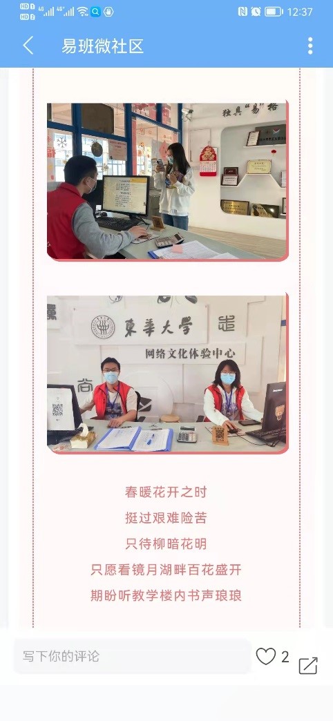 惟其艱難,方顯勇毅;惟其磨礪,始得玉成。突如其來的疫情打亂了日常生活節奏,在這場沒有硝煙的戰場中,東華大學輔導員團隊守望相助,并肩作戰,積極化身“戰疫尖兵”,用責任心與愛心為學生撐起健康安全“守護傘”。相信在全體東華人的共同努力下,東華校園終將迎來如約而至的春天。