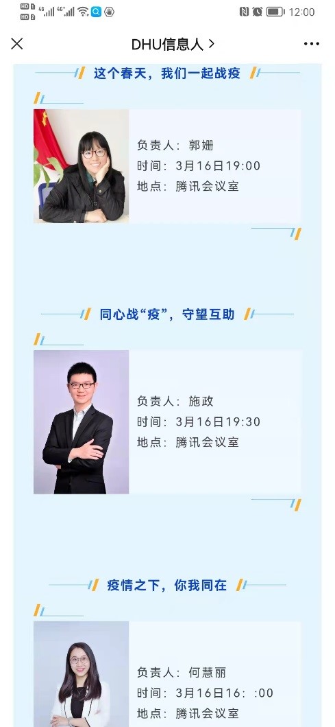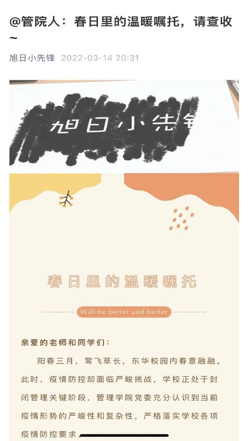 云班會、戰疫手記、主題微課、心理漫談……封閉管理期間,學校將戰“疫”鮮活素材作為思政教育的生動教科書,推出了一系列豐富多彩的思政教育“大餐”,確保思政教育“不間斷”、學生思想“不掉線”。旭日工商管理學院推出《致全體師生的一封信:春日里的溫暖囑托》,從思想引導、日常宣傳、深度輔導等多維度,做好學生思政教育。機械工程學院利用“機動天下”、“東華機械人”等網絡平臺營造同心抗“疫”、共促良好學習氛圍。信息科學與技術學院組織“同心戰疫”系列線上主題教育活動,全體專兼職輔導員分層分類設計戰疫故事分享、職業生涯規劃、心理健康教育等課程,引導學生正確認識疫情防控政策,積極參加線上學習。化學化工與生物工程學院舉辦“勠力同心守望相助”、“保哥帶你求職:學長學姐畢業去向與未來規劃”線上主題班會,時刻關注學生學業與生涯成長。材料科學與工程學院有效發揮學生黨員、學業幫扶小組、班導生等朋輩力量,針對學生個性化學習問題開展“點對點”輔導,貼心幫扶助力學生線上學習更高效。人文學院開展“云端互助學”活動,邀請關工委名師、紅色導師、紅色導生云上指導,助力學生高效在線學習。馬克思主義學院開設“偉大精神”系列課程,師生共同錄制“雷鋒精神”線上微課,將中國共產黨人精神譜系偉大精神云端傳遞。理學院開展防疫主題班會、主題黨日活動,引導學生提高防范意識,共筑思想引領和疫情防控雙重防線。心理健康教育與咨詢中心開設“心理漫談”系列線上講座,多角度、多主題為學生提供心理健康小貼士;增設線上心理咨詢、郵箱咨詢預約等方式,多渠道保障學生心理健康。豐富多彩的思政教育充實了學生的校園生活,多次擔任核酸檢測志愿者的學生小何說,“學校封閉管理期間,食堂每日三頓的美食讓我長了“肉肉”,老師們打造的精神食糧大餐更讓我漲了知識,也讓我們更有動力,為學校抗疫工作做點力所能及的事”。